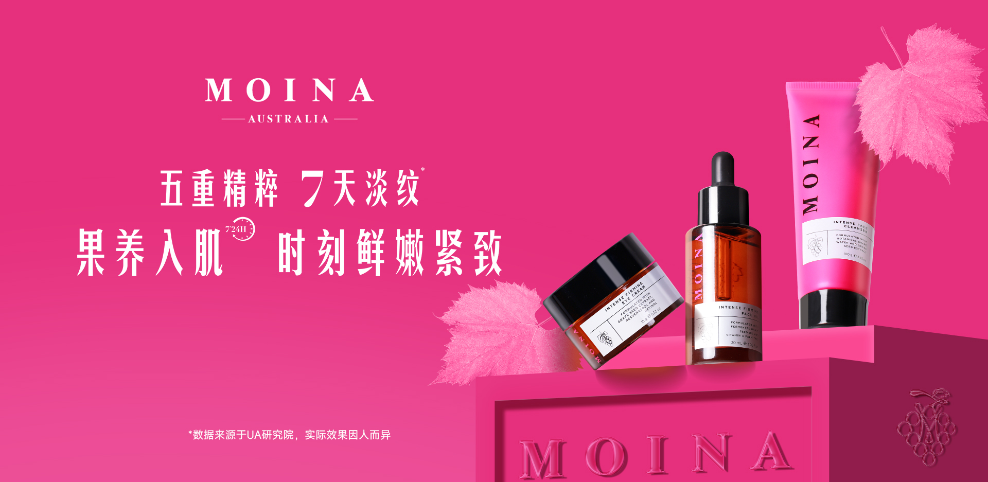 MOINA的品牌愿景:专注中国化妆品CS渠道,以澳洲进口,葡萄+科技的果养入肌护肤理念为核心差异,打造符合中国18-38岁热爱鲜果纯净护肤的年轻女性的护肤产品,品牌核心功效是紧致抗皱,让女性肌肤以果养入肌7*24H,时刻鲜嫩紧致。