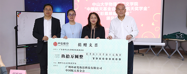 “中国航天基金会-环亚航天奖学金”由环亚集团捐资设立,用以奖励中山大学物理与天文学院及学校航天方向品学兼优、全面发展的同学,激励学生勤奋学习、大胆创新、努力进取,成为航天事业栋梁之才。