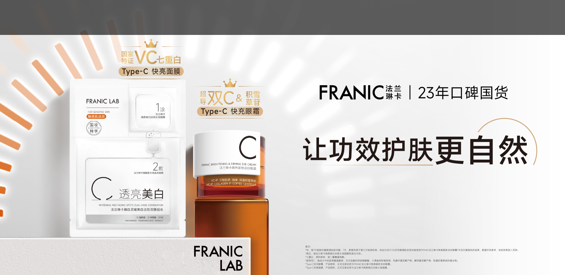 FRANIC法兰琳卡是环亚集团旗下的植物科技功效护肤品牌,创立于2002年。 多年来,法兰琳卡专注解决国民肌肤问题,潜心探索科技与植萃联结的美肤奥秘。 面对高功效诉求,现已探索出「科学活性物+植提+植物科技」这一“1+1+1>3”的高效科学配方公式。顺应肌肤的原生秩序,法兰琳卡秉承「实验室精神」和只做「好用护肤品」的信念,全球臻选优质植材,以科技为动力,升华前沿活性物的功效性和温和性,让成分间产生强大的协同效应,并进行多维功效测试,持续为肌肤注入有效不刺激的护肤能量。法兰琳卡不仅是植物护肤的时间旅行者,更是高功效的未来探险家,打造高功效植物科技护肤解决方案,为万千消费者提供简约而不简单、物超所值的护肤体验,靶向解决国民肌肤难题,焕活肌肤的美丽潜能。 |