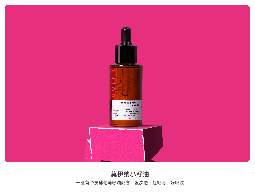 MOINA的品牌愿景:专注中国化妆品CS渠道,以澳洲进口,葡萄+科技的果养入肌护肤理念为核心差异,打造符合中国18-38岁热爱鲜果纯净护肤的年轻女性的护肤产品,品牌核心功效是紧致抗皱,让女性肌肤以果养入肌7*24H,时刻鲜嫩紧致。